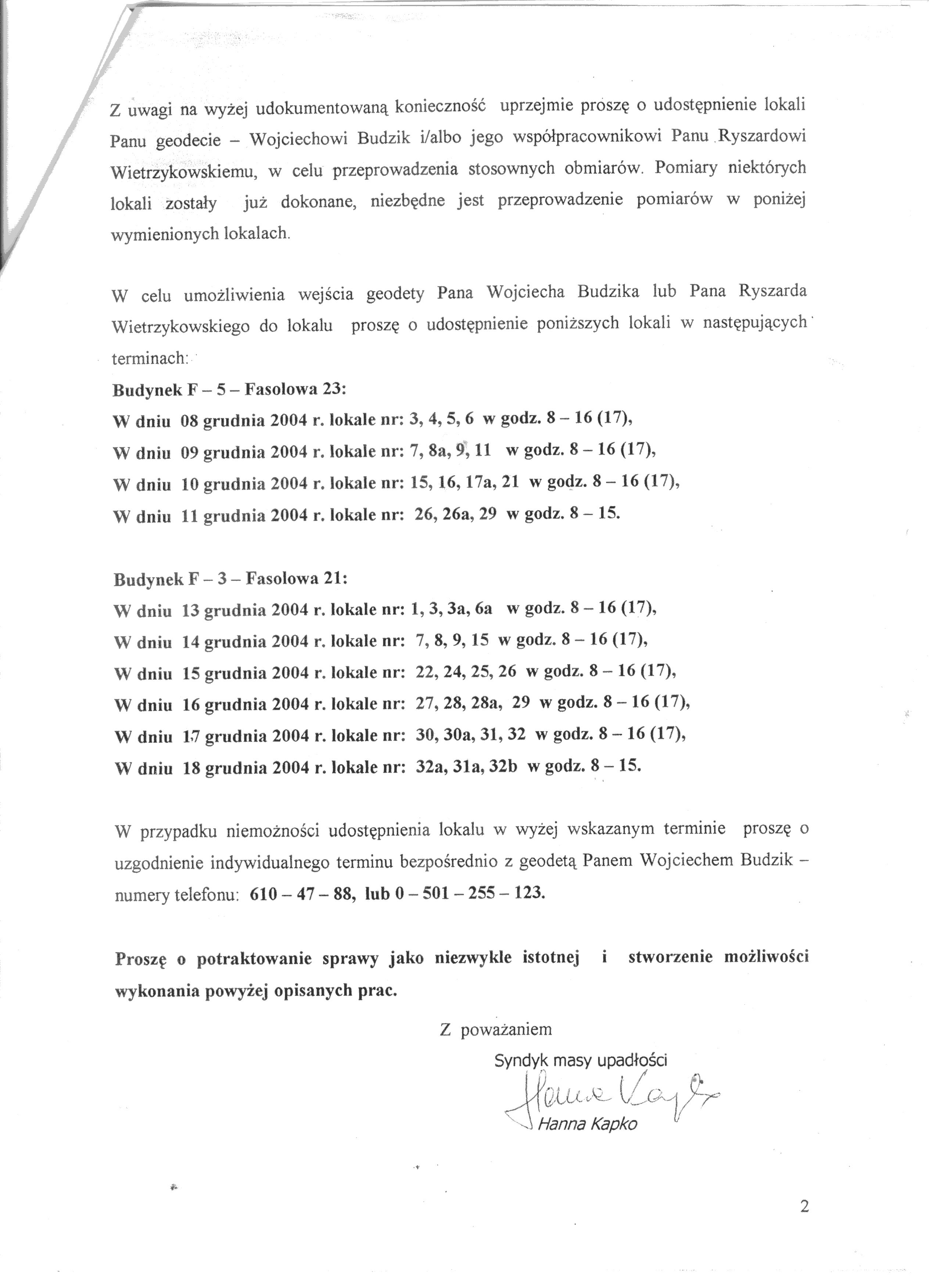 Poniżej zamieszczamy pismo Syndyka Masy Upadłości Przedsiębiorstwa Inwestycyjno-Budowlanego Idealne Mieszkanie Sp. z o.o. z dnia 6.12.2004 roku do właścicieli lokali w budynków Fasolowa 21 i 23.