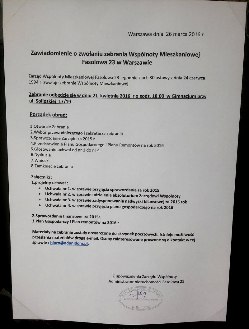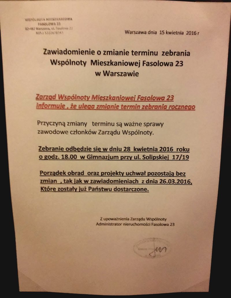 Zebranie, pierwotnie wyznaczone przez Administratora na 21.04, zostało powiadomieniem z dnia 15.04 przesunięte na 28.04.2016.