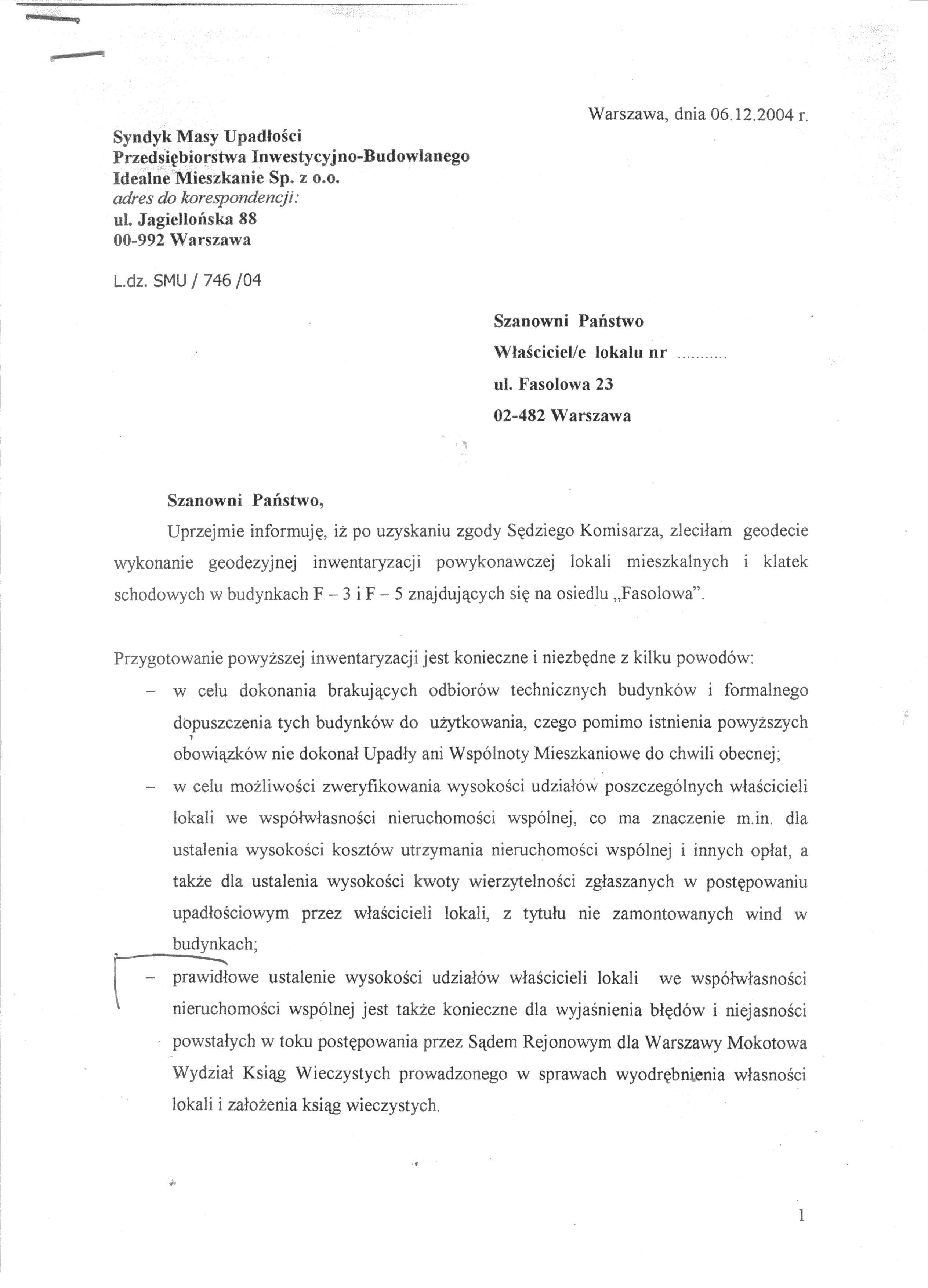 Poniżej zamieszczamy pismo Syndyka Masy Upadłości Przedsiębiorstwa Inwestycyjno-Budowlanego Idealne Mieszkanie Sp. z o.o. z dnia 6.12.2004 roku do właścicieli lokali w budynków Fasolowa 21 i 23.